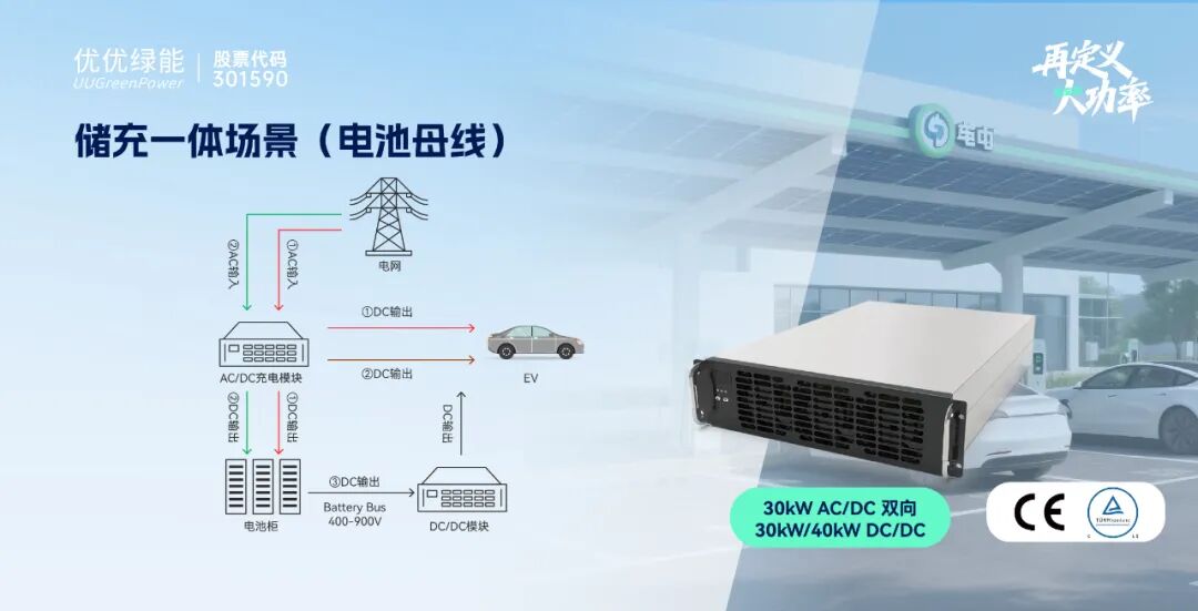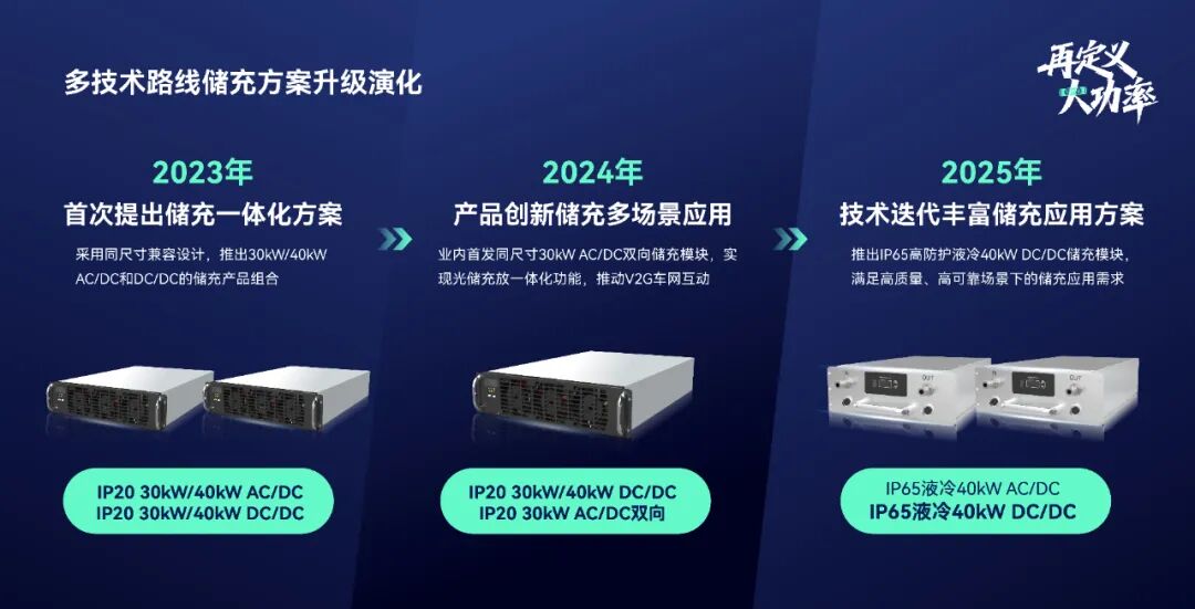 2023年优优绿能首次在业内提出兼容一体化储充解决方案,30/40kW AC/DC和DC/DC模块均采用同尺寸兼容设计理念,方便系统便捷化集成,助力产业储充一体化建设;在2024年优优绿能通过产品创新,业内首发同尺寸30kW AC/DC双向储充模块,实现光储充放一体化功能,支持国家V2G车网互动规模化试点应用;2025年基于第二代液冷储充技术,迭代推出IP65高防护液冷40kW DC/DC储充模块,满足高质量、高可靠场景下的储充应用需求,进一步完善多技术路线产品方案,为全球行业客户提供IP20风冷散热和IP65全液冷散热两种技术路线的储充方案。