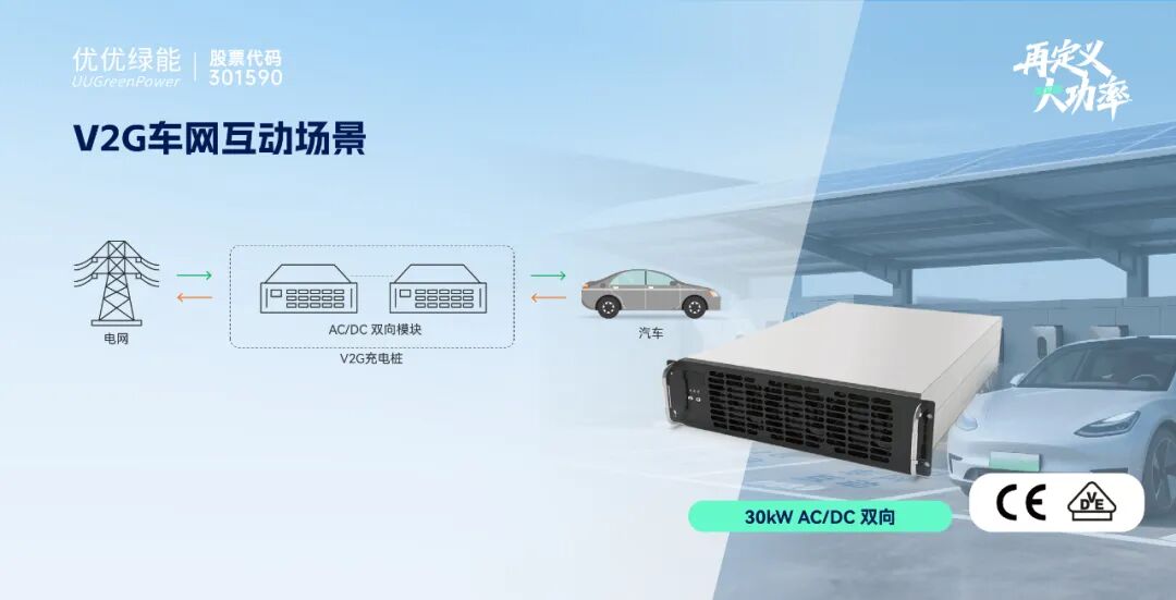 2024年以来,V2G车网互动从试点应用到全国城市规模化建设,优优绿能基于双向充放电技术推出的30kW双向AC/DC模块和30kW双向DC/DC模块,输出电压范围150V~1000V,覆盖市面电动汽车全车型V2G充放电,尺寸与30kW AC/DC完全兼容,可帮助充电桩便捷升级成V2G充放电桩。