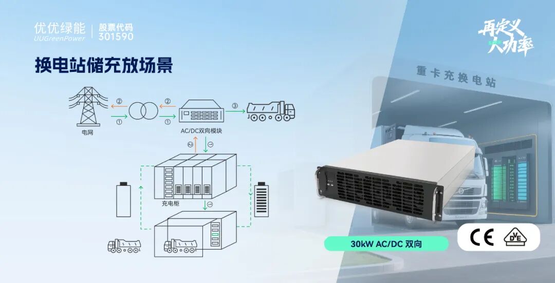 优优绿能双向AC/DC充放电模块已广泛应用于全国V2G车网互动示范站、光储充放标杆站、换电站等场景,同时模块也已获得欧盟CE认证、德国VDE并网和国标GB/T 34120-2020并网认证。
